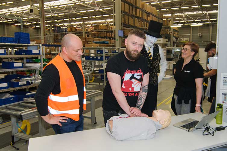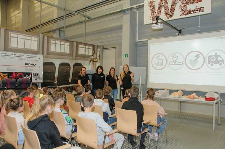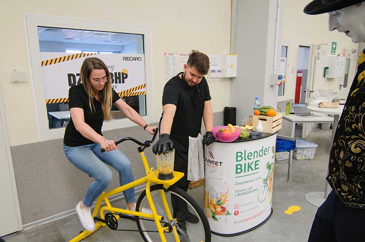 - Pracownikom RECARO przedstawiono zasady prawidłowego mycia rąk w czasie 30 sekund i zasady resuscytacji krążeniowo-oddechowej. Pracownicy mieli również okazję samodzielnie przygotować („wyprodukować”) zdrowe soki dzięki własnej sile mięśni i roweru z zamontowanym blenderem (połączenie aktywności ruchowej ze zdrowym odżywianiem). Zaproszony mim w sposób parodiowy przedstawił niebezpieczne sytuacje w pracy, takie jak np. uderzenie się młotkiem w palec czy zahaczenie.