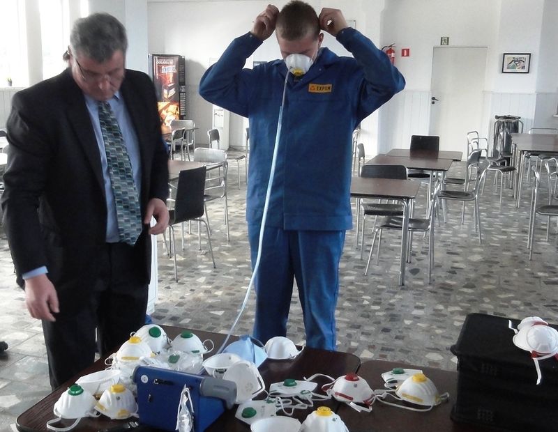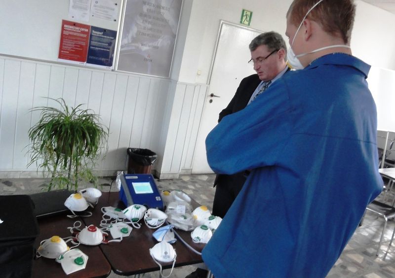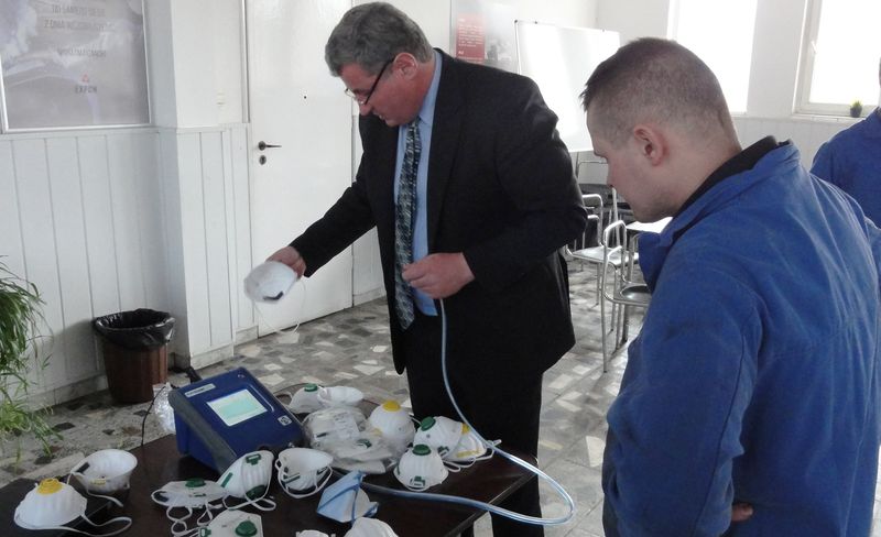 W pierwszej części wystąpienia zwrócono uwagę na pyły powstające podczas produkcji konstrukcji stalowych tj. pył zawierający wolną (krystaliczną) krzemionkę od 2% do 50% - frakcję wdychaną oraz respirabilną a także ich szkodliwy wpływ na zdrowie pracowników. Celem drugiej części szkolenia było przedstawienie prawidłowego doboru półmasek przeciwpyłowych. Do sprawdzenia prawidłowego dopasowania środka ochrony dróg oddechowych do konkretnego pracownika służyło urządzenie PortaCount. Pozwoliło ono w prosty i wiarygodny sposób wyznaczyć współczynnik skuteczności dopasowania maski, czy półmaski do twarzy (głowy) użytkownika. Testowanie półmasek realizowane było podczas naturalnych ruchów, które pracownik wykonuje podczas codziennej pracy. Urządzenie PortaCount określa stosunek zapylenie powietrza na zewnątrz i wewnątrz półmaski (założonej na głowę użytkownika). Urządzenie zlicza cząsteczki pyłu na zewnątrz i wewnątrz maski. Jeżeli np. współczynnik dopasowania wynosi 50 jednostek to oznacza, że powietrze wewnątrz półmaski zawiera 50 razy mniej pyłu niż powietrze na zewnątrz półmaski. Po podłączeniu urządzenia do komputera ustawiano wymaganą krotność obniżenia zapylenia dla danej klasy sprzętu i w ten prosty sposób sprawdzano, czy dana półmaska rzeczywiście chroni pracownika. Przeprowadzenie kontroli było automatyczne i powtarzalne a wyniki uzyskiwane natychmiast - rezultatem natomiast była prosta odpowiedź: „Szczelna/ Nieszczelna”. Podczas testów w większości przypadków okazało się, iż zalecana jest zmiana typu stosowanej półmaski.