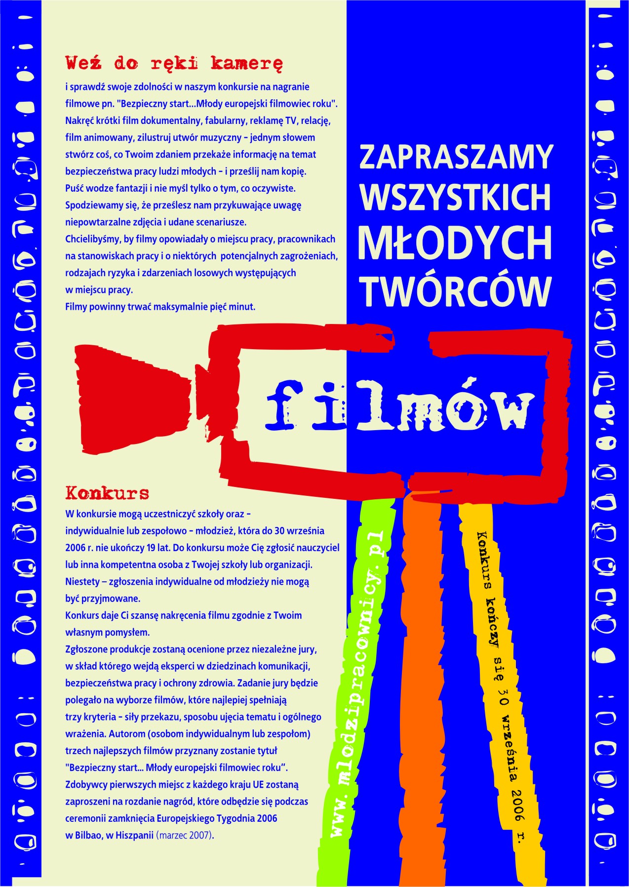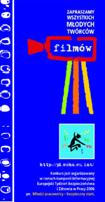 Weź do ręki kamerę i sprawdź swoje zdolności w naszym konkursie na nagranie wideo pn. "Bezpieczny start...Młody europejski filmowiec roku". Nakręć krótki film dokumentalny, fabularny, reklamę TV, relację, film animowany, zilustruj utwór muzyczny, - jednym słowem stwórz coś, co Twoim zdaniem przekaże informację na temat BHP - i prześlij nam kopię. Puść wodze fantazji i nie myśl tylko o tym, co oczywiste. Spodziewamy się, że prześlesz nam przykuwające uwagę niepowtarzalne zdjęcia i udane scenariusze.